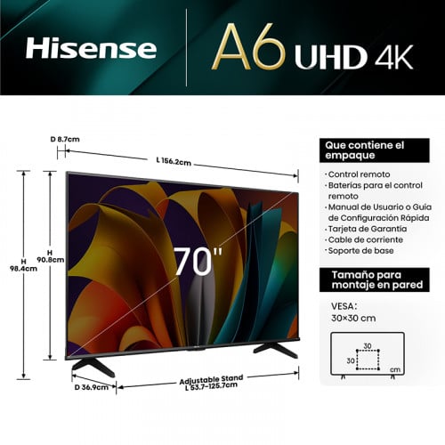 La Smart Tv Led 70 Pulgadas VIDAA Voice 4K UHD Negro Hisense ofrece una combinación de tamaño, calidad de imagen y funciones inteligentes que te permitira disfrutar de un entretenimiento superior en la comodidad de tu hogar. Cuenta con un sistema operativo inteligente que brinda acceso rápido y fácil a una amplia gama de aplicaciones, contenido en línea y servicios de transmisión.